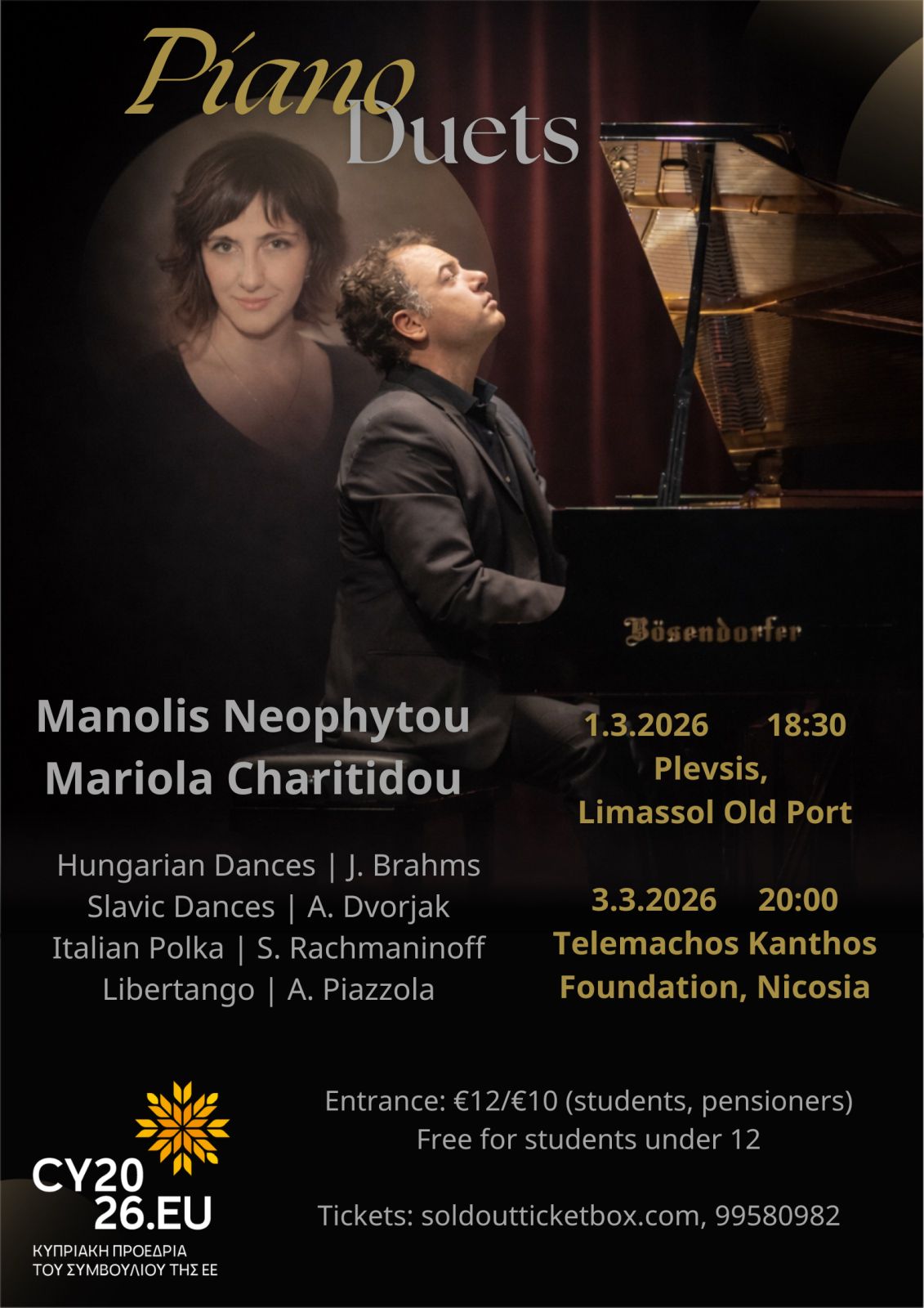 Piano Duets with Manolis Neophytou and Mariola Charitidou. The programme includes Brahms- Hungarian Dances, Dvorzak- Slavonic dances, Rachmaninoff Italian Polka, Piazzolla-Libertango, Hadjidakis-Dances.